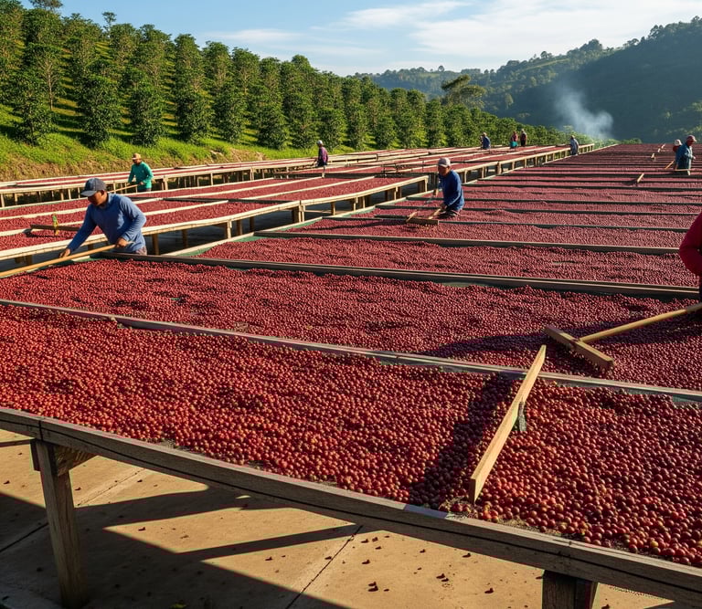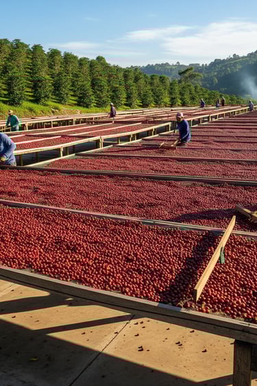 Drying: The whole, unpulped coffee cherries are spread out to dry in the sun, typically on large patios or raised beds. This drying process can take several weeks, during which the fruit surrounding the bean ferments and dries onto the bean. The cherries are regularly turned to ensure even drying and prevent mold.