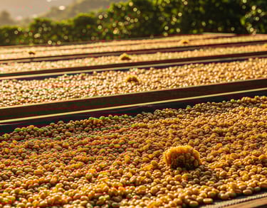 Drying: The clean parchment coffee (the bean still encased in its protective parchment layer) is then dried, either on raised beds, patios, or in mechanical dryers, until it reaches an optimal moisture content (typically 10-12%).