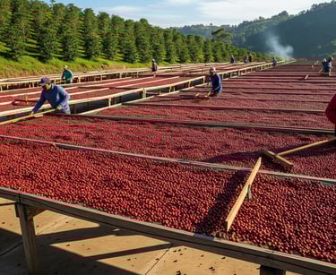 Drying: The whole, unpulped coffee cherries are spread out to dry in the sun, typically on large patios or raised beds. This drying process can take several weeks, during which the fruit surrounding the bean ferments and dries onto the bean. The cherries are regularly turned to ensure even drying and prevent mold.